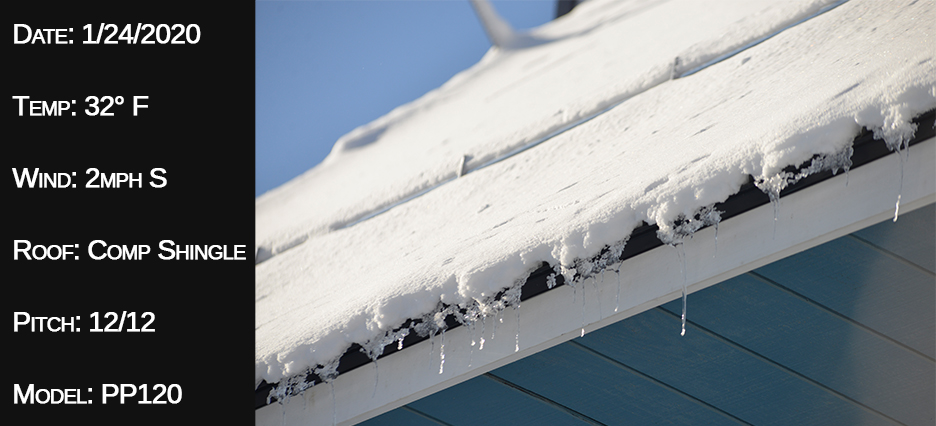 We completed the installation of the PP120 system during the first few days of November 2019, on the 12/12 pitch side of the roof. We received several snowfalls between November and January, none resulting in much accumulation.
