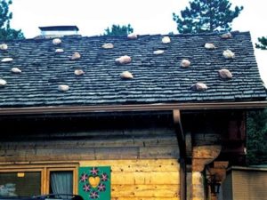 This is a classic example of someone who should not be giving snow retention advice. It seems this is a fairly common misconception. These rocks were actually placed on the roof to keep the wood shingles from curling as they dried out. Back in the 1700’s and 1800’s, when cedar shingles were available in long, 30”-36” lengths, installers would often wire lumber or small branches on top of the shingles to reduce curling. The unintended consequence was snow retention. However, I can assure you that any right-minded individual would never lay loose rocks on their roof at the risk of them being pushed off by a roof avalanche, potentially causing catastrophic damage to people or property.