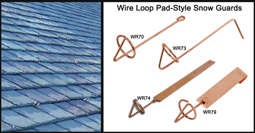 In the 1980’s and 1990’s, as slate became more popular, roofers who didn’t understand how snow guards work started installing wire loops in a two-to-three row pattern around the eaves of slate roofs. Needless to say, these guards were flattened in the first year. End result? Customer expectations were not being met, roofers blamed the snow guards, wire loops got a bad name and, as a result, have more or less disappeared from the market.