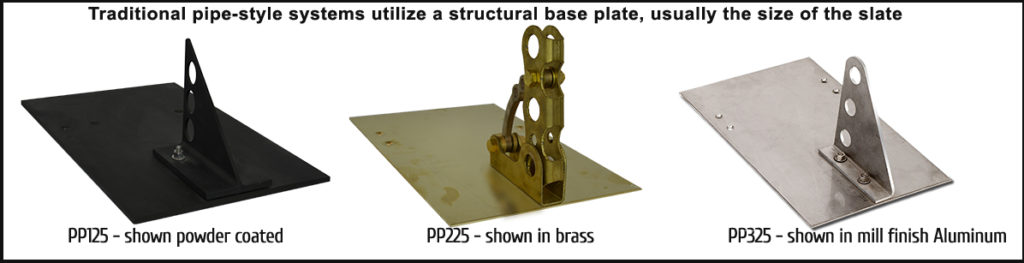 Probably the biggest difference between the Fusion-Guard system and traditional “pipe-style” systems, is the attachment mechanism. Traditional pipe-style systems utilize a structural base plate that’s typically the size of a piece of slate. Below are a few examples.