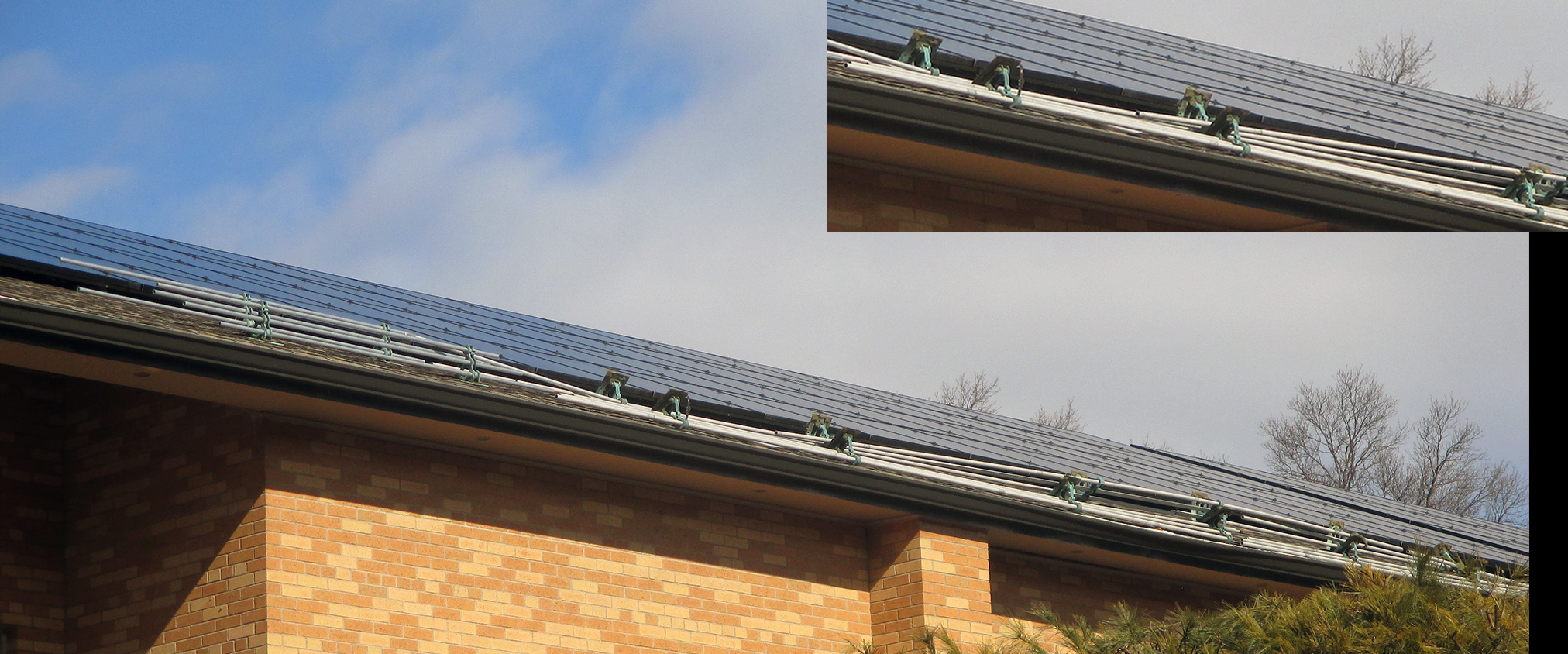 On top of the church is a large array of solar panels: 34 panels total, stretching four panels high from ridge, to near the eave edge. The original roof installer did take precautions and installed two rows of a three-pipe snow retention system, salvaged from the existing roof, below the array near the eave edge. The problem they are having is that they did not account for the snow mass to be on the move when it struck the guards.